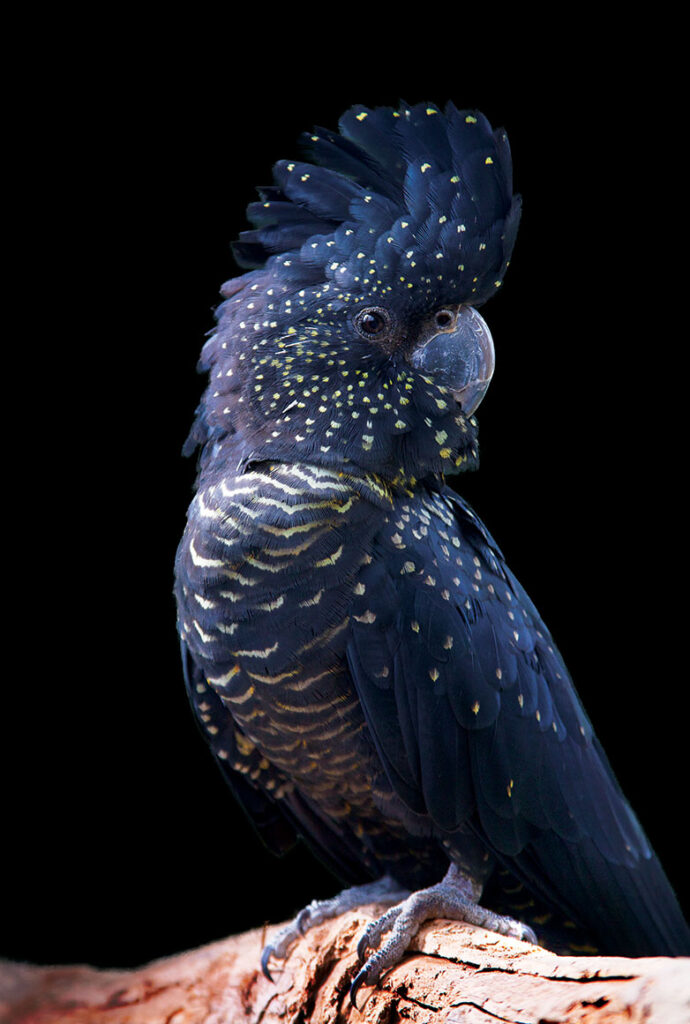 Female red-tailed black cockatoos are black with yellow-orange stripes in the tail and chest, and yellow grading to red spots on the cheeks and wings. The bill is pale and horn-colored. The underparts are barred with fine yellow over a black base.